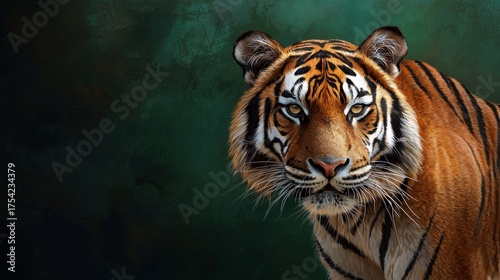 Fototapeta premium Stunning tiger portrait showcasing intricate details of its fur and vivid expression against a dark, lush background