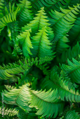 © icemanphotos, Obraz premium Stunning top view of lush green fern leaves creating peaceful relaxing nature background, serene tropical garden foliage for eco wallpaper, natural decoration and botanical inspire wall art design