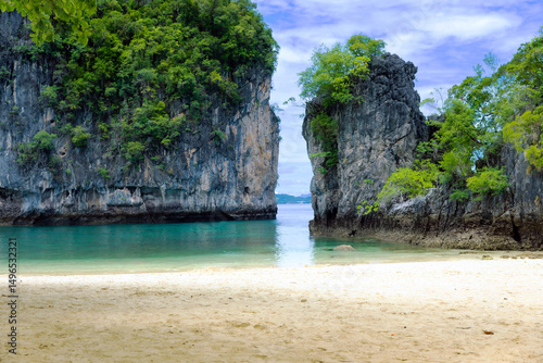 © Danchai, Obraz premium Stunning tropical beach on Hong Island in Krabi Province, Thailand. Surrounded by emerald waters, dramatic limestone cliffs, Ideal for tropical beach pictures, beach screensavers