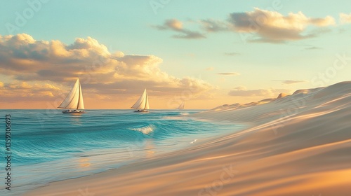 Obraz premium Stunning tropical beach with soft dunes and a turquoise sea, white sails dotting the ocean under pastel skies, warm light highlighting the serene beauty