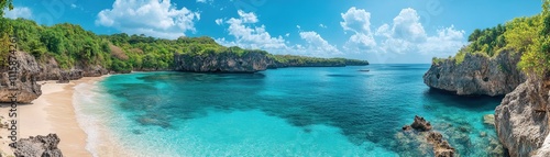 Fototapeta premium Stunning Tropical Beach with Turquoise Waters and Lush Green Cliffs Under a...