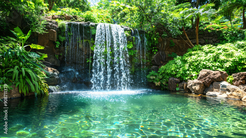 Naklejka premium Stunning Tropical Waterfall Cascading into a Crystal Clear Pool Surrounded by Lush Greenery and Exotic Plants