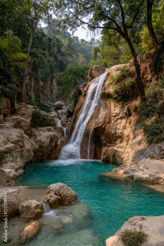 © Praphat, Fototapeta premium Stunning Tropical Waterfall Cascading into Crystal Clear Pool