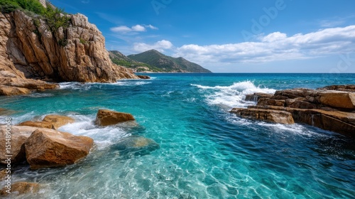 © FarhaStock, Fototapeta premium Stunning Turquoise Ocean Waves Crashing Against Rocky Coastline on a Sunny Day