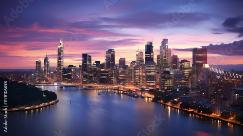 © Hettie, Fototapeta premium Stunning Twilight Panorama of Modern Cityscape with River Reflection, HD Image