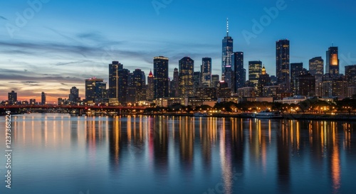 © Nurul wahidah, Fototapeta premium Stunning Twilight Panorama of the New York City Skyline Reflected in the Calm Waters