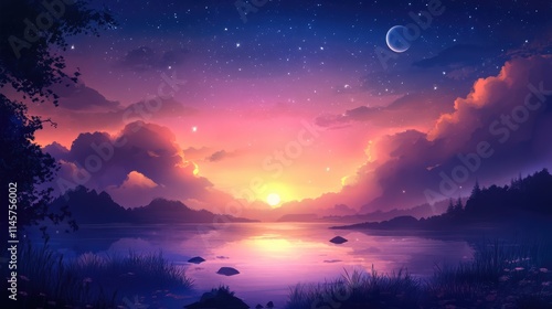 Fototapeta premium Stunning twilight sky over tranquil lake with vibrant colors and starry night landscape scene