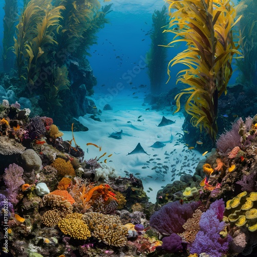 © Korn, Fototapeta premium Stunning underwater photo of a vibrant coral reef filled with colorful marine life, various fish species, and sea plants, set against a serene blue ocean backdrop with rays swimming in the distance.