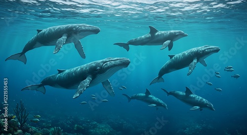 Obraz premium Stunning underwater scene with whales, dolphins, and fish in a vibrant blue...