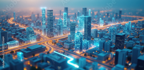 © Tanakorn, Obraz premium stunning urban environment showcases futuristic cityscape with glowing buildings and vibrant lights, emphasizing goal of net zero emissions