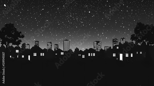 Fototapeta premium Stunning Urban Night Cityscape: Silhouettes, Skylines, and Stars in Modern Black and White