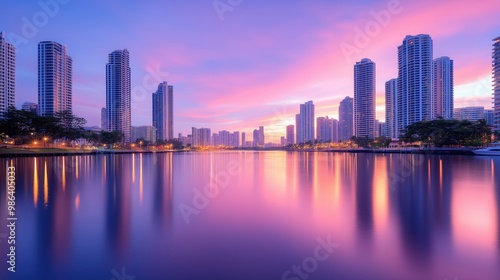 © Thitaya, Fototapeta premium Stunning Urban Skyline at Dusk with Reflective Water and Vibrant Sky in Modern Cityscape