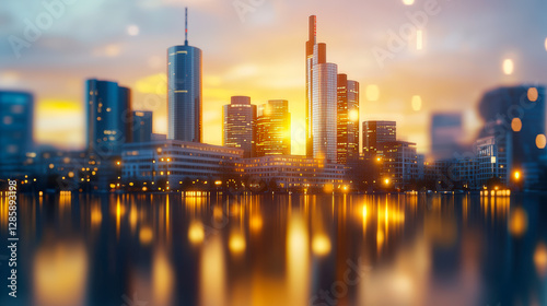 Fototapeta premium Stunning urban skyline at sunset, reflecting on the water, showcasing modern...