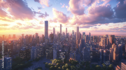 © Thanthara, Fototapeta premium stunning urban skyline at sunset, showcasing tall buildings and vibrant colors