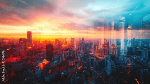 Fototapeta premium Stunning urban skyline at sunset, showcasing vibrant colors and dynamic...