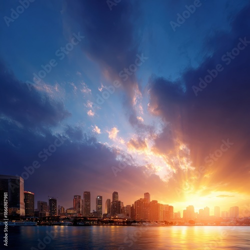 © Iryna, Fototapeta premium Stunning urban skyline at sunset with dramatic clouds and reflected cityscape