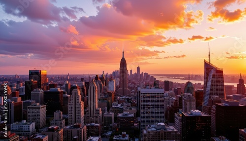 © OnuTH, Fototapeta premium Stunning Urban Skyline at Sunset with Vibrant Clouds and Illuminated Buildings in New York City