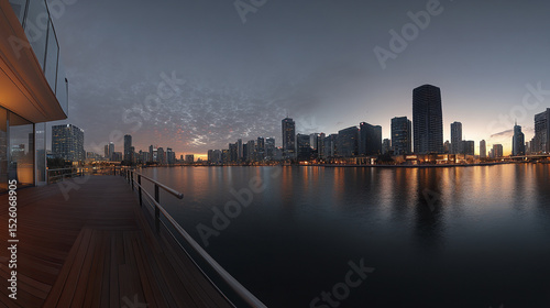 Naklejka premium stunning urban skyline dusk, reflecting calm water, showcasing modern architecture and vibrant
