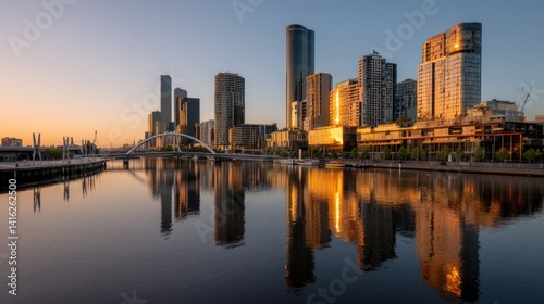 Naklejka premium Stunning urban skyline reflecting in calm waters at sunset, showcasing modern...