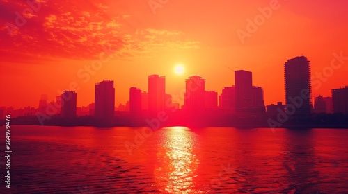 Fototapeta premium Stunning Urban Sunset Over River with Vibrant Red and Orange Sky, Capturing...