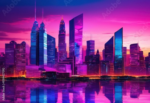 © Yaroslava, Fototapeta premium stunning vibrant city skyline dusk showcasing reflective glass architecture modern urban aesthetic brilliant colorful light displays, cityscape, buildings