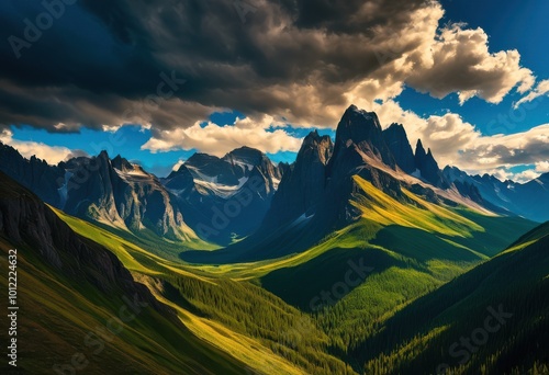 Obraz premium stunning vibrant mountain range under dynamic dramatic cloudscape clear skies...