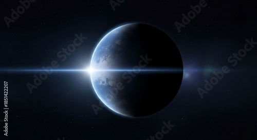© Ja, Obraz premium Stunning View of a Distant Planet with a Bright Lens Flare in Deep Space.