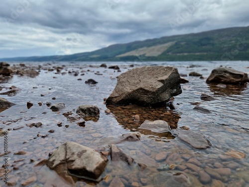 Obraz premium Stunning view of a serene lake surrounded by large rocks
