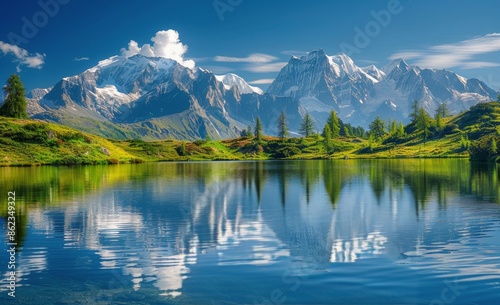 © olegganko, Naklejka premium Stunning View Of A Tranquil Lake And Snow-Capped Mountains On A Sunny Day