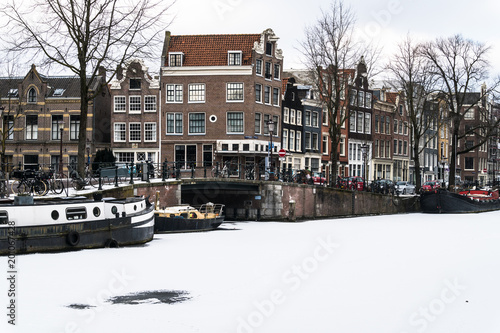 Obraz premium Stunning view of Amsterdam canals and house boat frozen with snow during the cold wave in February 2018 on a very cold winter day.
