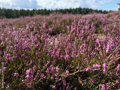 Naklejka premium Stunning view of blooming heath with pink purple heather flowers in famous nature reserve park Lueneburger Heide in North Germany