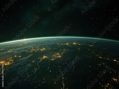 © Bramcrye, Fototapeta premium Stunning view of Earth at night with glowing city lights under a starry sky.