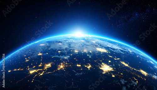 © chok, Obraz premium Stunning view of Earth from space, showcasing planet curvature, illuminated cities, and bright sunrise on horizon