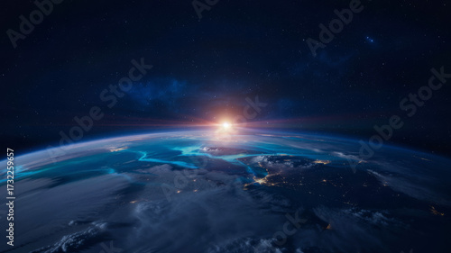 Obraz premium Stunning view of earth from space with sunrise over the horizon and city lights below
