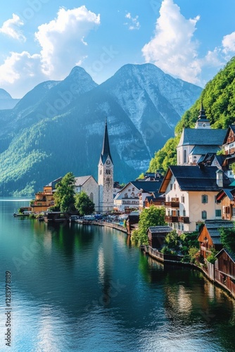 © Lindamar, Fototapeta premium Stunning view of famous Hallstatt mountain village with Hallstatter lake. Popular travel destination. Location: Hallstatt, Salzkammergut region, Austria, Alps. Europe.