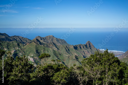 © Pierre, Naklejka premium Stunning view of lush green mountains cascading down to the vibrant blue ocean in Tenerife.