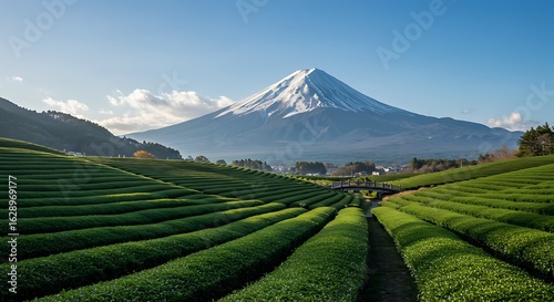 © Lerivan, Obraz premium Stunning view of Mount Fuji and vibrant green tea fields under a clear sky in Japan.