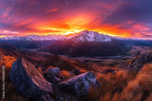 © ChaoticMind, Obraz premium Stunning view of mountain peaks with a vibrant sunset sky, rocky foreground, and sweeping landscapes, capturing nature's majesty in a breathtaking scene.