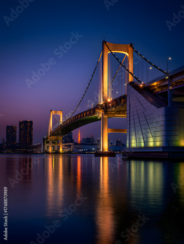 © Thisisbest, Obraz premium Stunning View of the Legendary Rainbow Bridge in Tokyo, Japan Glowing at Dusk Over the Water
