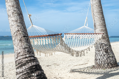 © Svetlana, Fototapeta premium Stunning views of an empty beach, palm trees, and a hammock on a wonderful island. Clear, sunny day, warm sunlight. No people, outdoors. Concept of leisure and travel