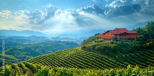 Fototapeta premium Stunning vineyard hillside scene featuring rich greenery, an antique farmhouse, and the enduring essence of traditional wine culture