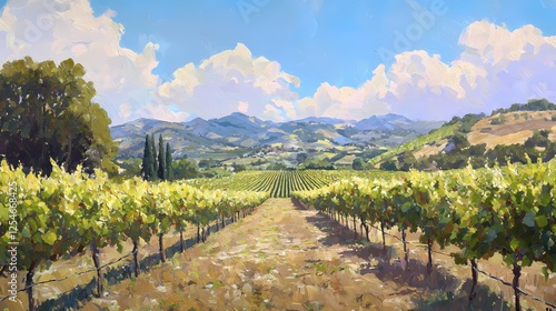 © Ketobox, Fototapeta premium Stunning Vineyard Landscape Painting with Rolling Hills and Dramatic Clouds in the Sunny Sky