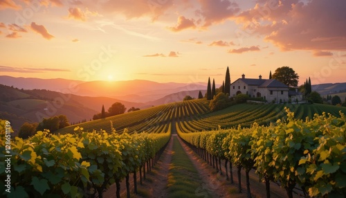 © Skyfe, Fototapeta premium Stunning Vineyard Sunset Lush Green Grape Vines Rustic Farmhouse Rolling Hills - Wine Tourism Marketing Travel Promotion