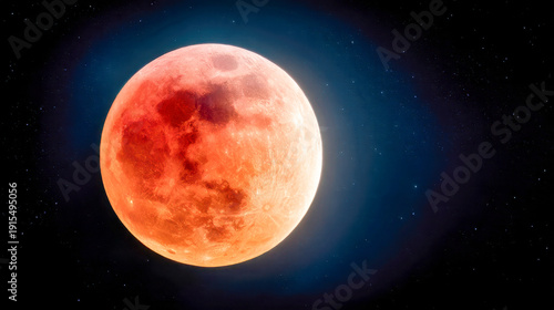 © Daria, Fototapeta premium Stunning vivid full lunar eclipse with bright red-orange moon glowing against a dark starry night sky in stunning outer space scenery