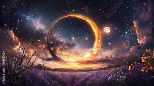 © นิโลบล ชํานาญธรรม, Fototapeta premium stunning watercolor painting of lavender field under starry sky, featuring large crescent moon and smaller moon, creating magical atmosphere