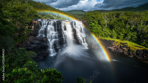 Fototapeta premium stunning waterfall cascading into serene pool, with vibrant rainbow arching...