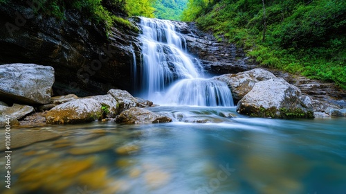 © Dragon42, Obraz premium Stunning Waterfall Cascading Over Rocks in a Lush Green Forest with Crystal Clear Pool Below