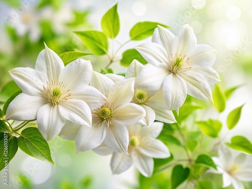 Fototapeta premium Stunning White Clematis Flowers with Bokeh Background - Stock Photo