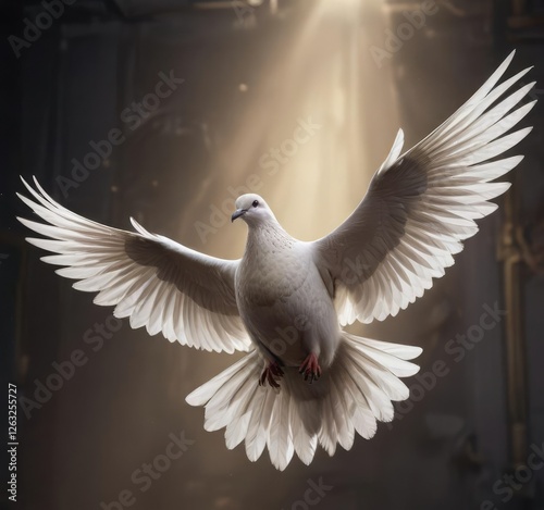 Obraz premium Stunning white dove with outstretched wings in dramatic lighting, peaceful,...