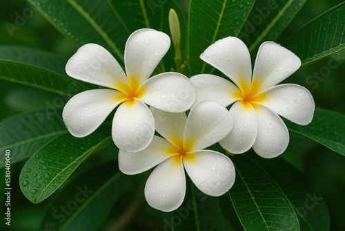 © AkuAku, Fototapeta premium Stunning white frangipani blossoms glistening with morning dew